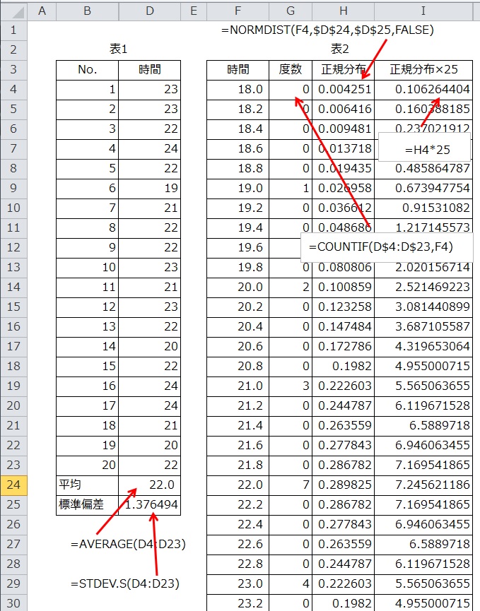 この表さえ作れば、ヒストグラムと正規分布のカーブはできたも同じ