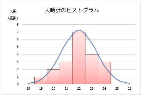 時間を横軸にして、度数を棒グラフ、正規分布×25を折れ線グラフにして一つのチャートにすれば、前述のヒストグラムの出来上がりです。