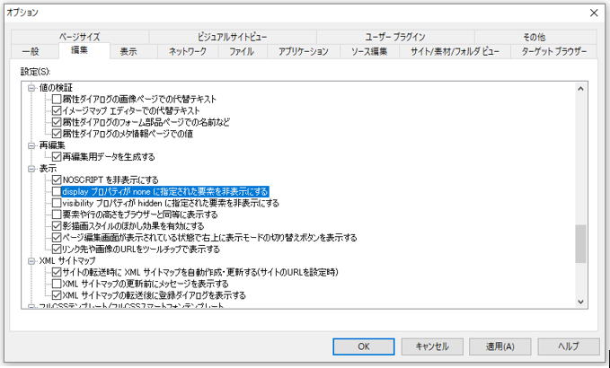 ②次に開いたオプション画面から編集タグを選択し、表示グループにある”displayプロパティーがnoneに指定された要素を非表示にする”のレ点を外します。