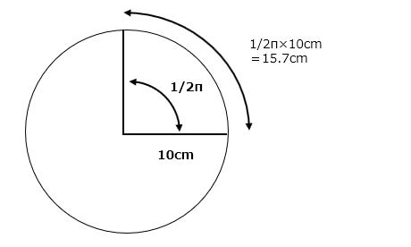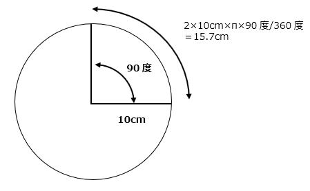 ところがラジアン表示の場合、単に1/2πラジアン(1.570ラジアン)に半径の10cmを掛ければ、15.7cmとあっという間に答えを導き出す事ができるのです。