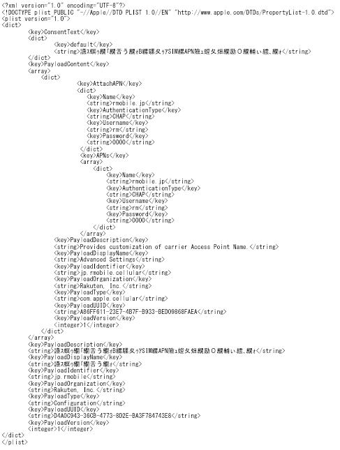 これでようやく正しいプロファイルをインストールできると喜んだのも束の間で、いざこのURLを開いてみると、以下の様な文字化けしたコードが表示されてしまいます。