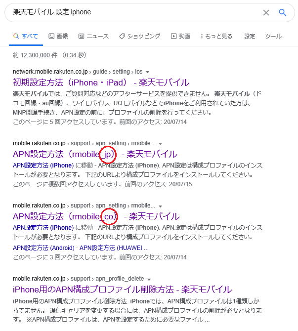 下はGoogle で”楽天モバイル 設定 iphone”と検索した結果です。