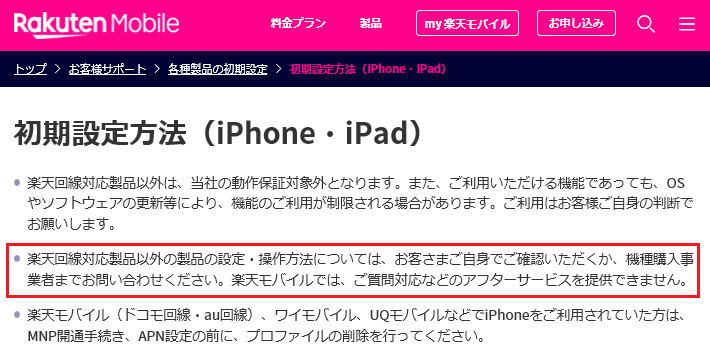 思い切って楽天モバイルに問い合わせしようかとも思ったのですが、以下の様に楽天の回線対応製品以外に質問対応には一切対応しないと明記されていますので、それも難しそうです。
