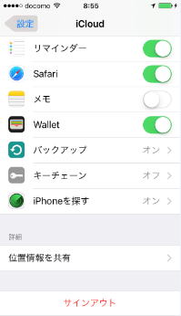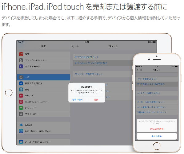 1) バックアップの保存バックアップの保存については、Appleの公式HPに記載がありますので、こちらを参考に願います。 ![]() 2) iCloudの切断iPhoneの場合、バックアップを自動的に保存するため、iCloudに接続している可能性があります。 このため以下の手順で、iCloudとの接続を遮断します。 ![]() 設定→iCloud→サインアウト(iOS 7 以前は”アカウントを削除”) →サインアウト→iPhone から削除→パスワードの入力 以上でiCloudとの切断は完了しました。 これをやっておかないでiPhone内のデータを消去すると、iCloudにバックアップしたデータも同じ様に消去されてしまいますので、ご注意願います。 3) 工場出荷状態に戻すiCloudとの切断が完了したら、以下の手順で本体を工場出荷状態に戻します。 設定→一般→リセット→すべてのコンテンツと設定を消去